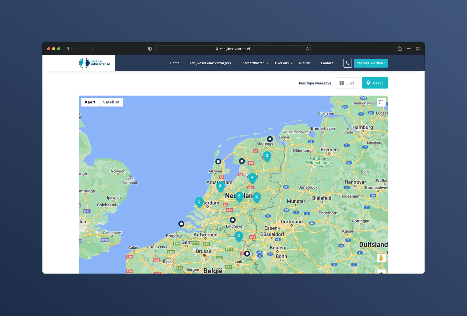 Omdat er in sommige regio’s veel adressen samenkomen, hebben we clustering toegepast. Markers worden samengevoegd tot overzichtelijke groepen en pas wanneer je inzoomt, verschijnen de afzonderlijke locaties. Dat maakt het navigeren rustiger, duidelijker en gebruiksvriendelijker. Precies wat je op zo’n moment nodig hebt.