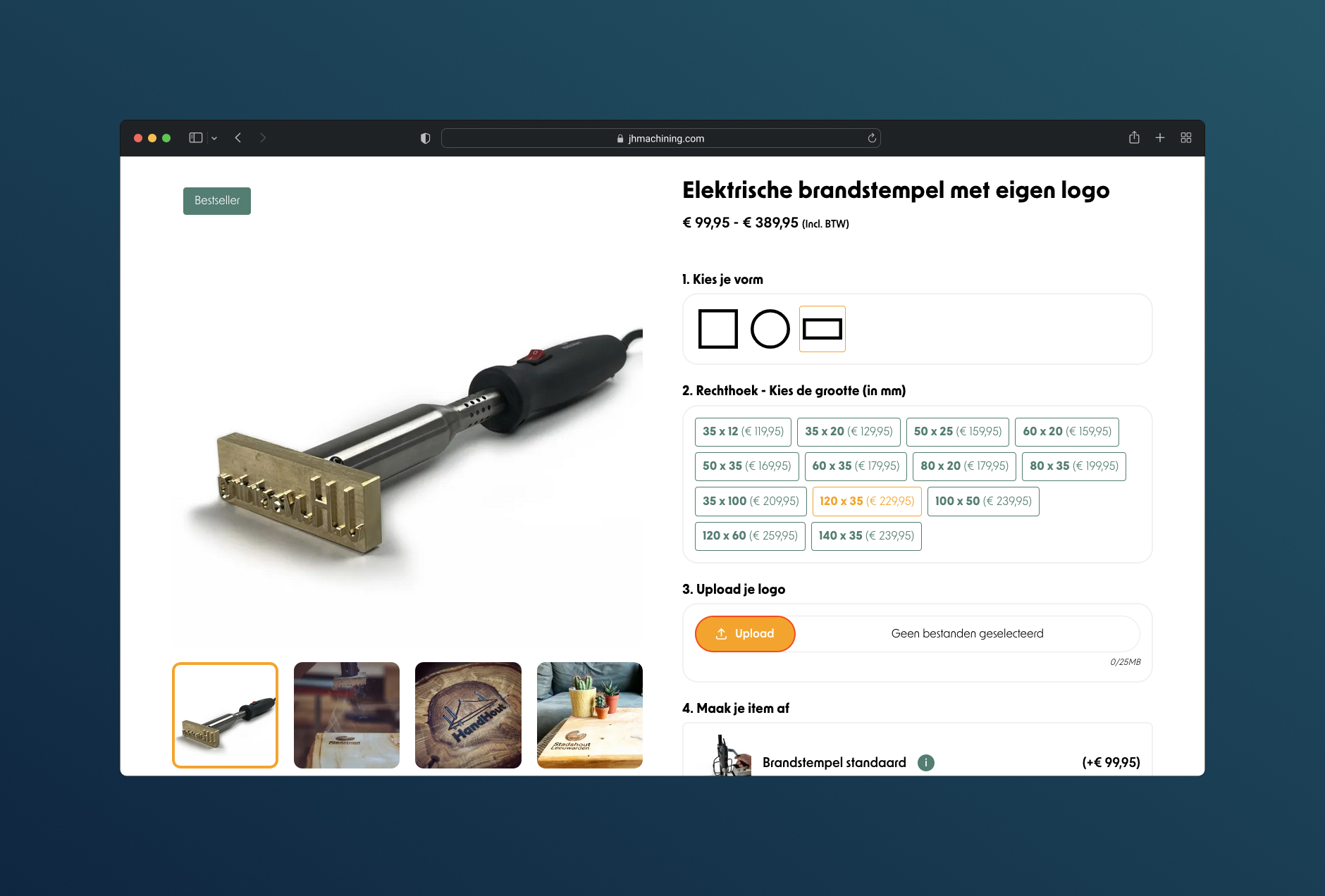 De product configurator voor de brandstempels vormt een essentieel onderdeel van de webshop. Omdat elk product volledig op maat wordt samengesteld, van logo en formaat tot toepassing, voldeed een standaard WooCommerce-oplossing simpelweg niet. In plaats daarvan ontwikkelden we een maatwerk product configurator waarin alle keuzes logisch op elkaar aansluiten en direct gevalideerd worden. Dit maakt het mogelijk om complexe productopties overzichtelijk te presenteren, gebruikers stap voor stap te begeleiden en fouten in het bestelproces te voorkomen. Het resultaat is een intuïtieve configurator die exact aansluit op het productieproces achter de schermen en tegelijkertijd zorgt voor een soepele, begrijpelijke ervaring aan de voorkant.