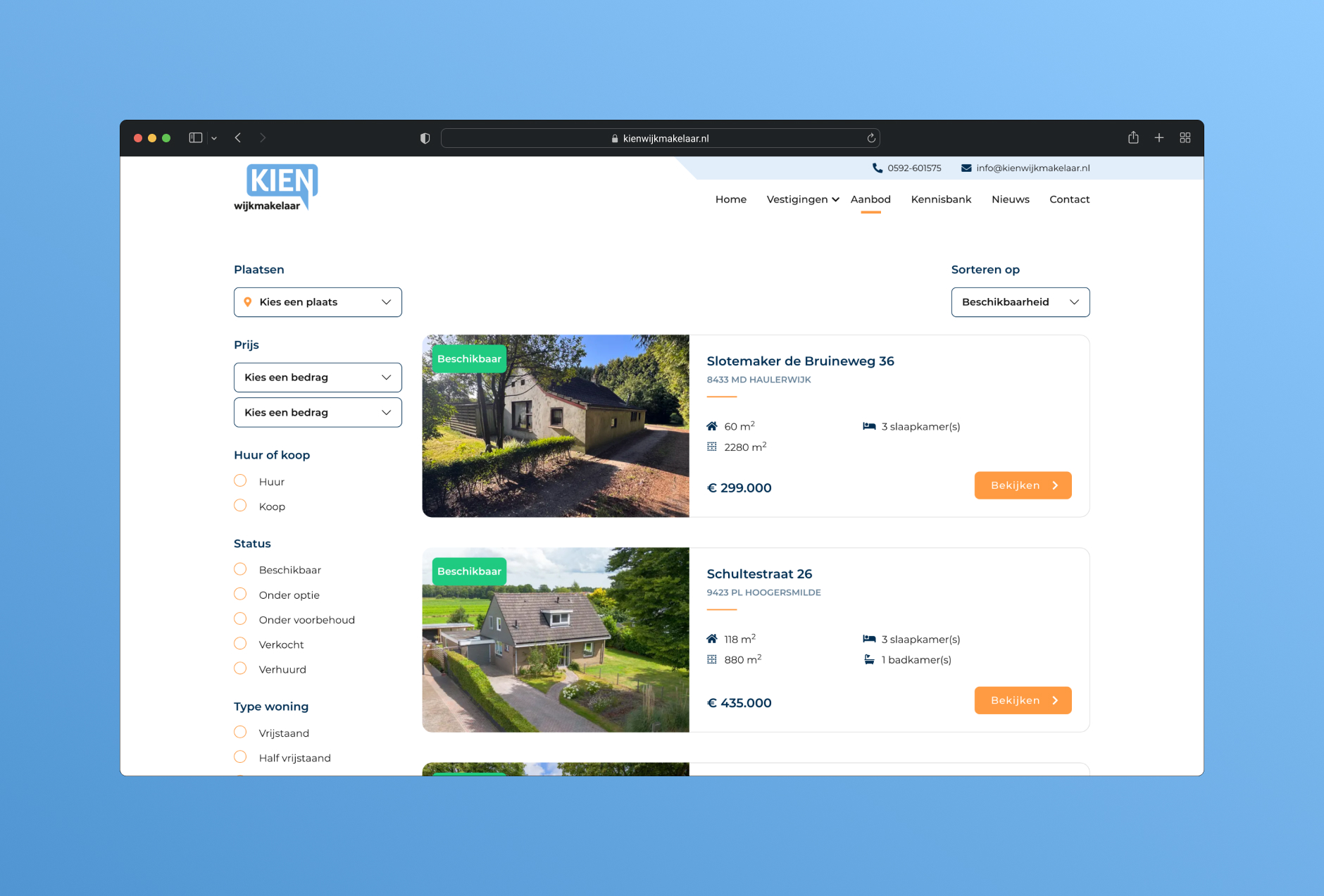 Het woningaanbod van KIEN beweegt mee met de wijk, en dat mag geen dag achterlopen. Daarom maakten we een directe koppeling met Realworks, de software waarin makelaars hun aanbod beheren. Nieuwe huizen, wijzigingen of verkochte objecten? Ze verschijnen automatisch op de site, zonder dat iemand er nog omkijken naar heeft.