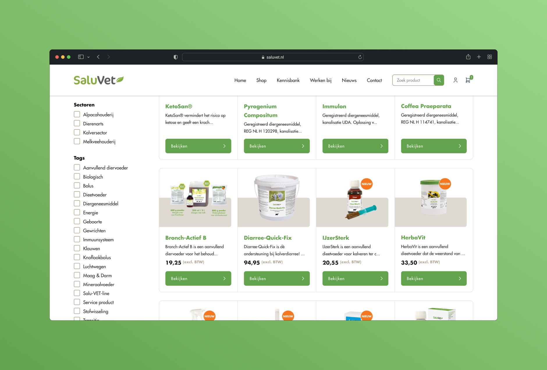 Voor SaluVet kregen wij de opdracht om hun nieuwe website te ontwerpen en te bouwen, met een heldere en professionele uitstraling die aansluit bij hun rol als leverancier van medicijnen voor boeren, veeartsen en consumenten.