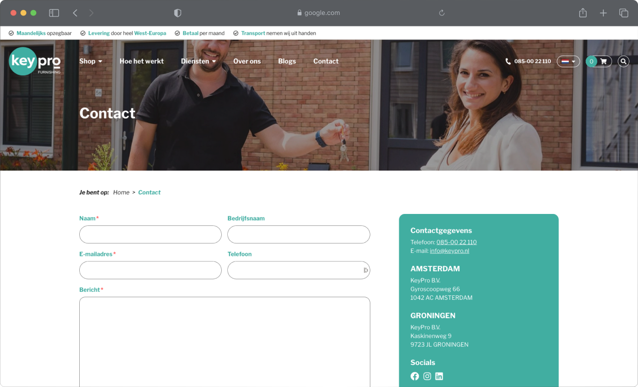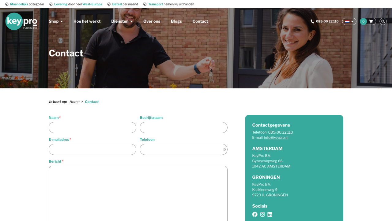 Keypro had al een webshop draaien waarbij de producten zelf moesten worden toegevoegd of worden aangepast. Met een steeds breder wordend assortiment werd het bijhouden van de producten op de webshop een steeds grotere taak. Met het oog op al een optimalisatieslag in het design besloten ze te gaan voor een nieuwe webshop waarbij WordPress in de basis gebruikt moest worden. Om de steeds meer tijdrovende klus van het bijhouden van alle producten te verkleinen hebben wij een koppeling gelegd worden met verhuur administratiesoftware. En alles moest worden gegoten in de al bestaande huisstijl van Keypro.