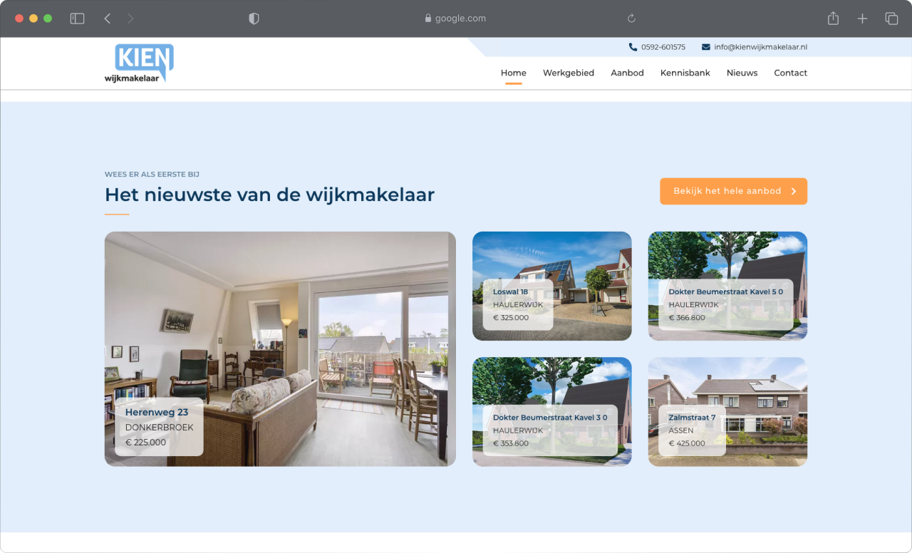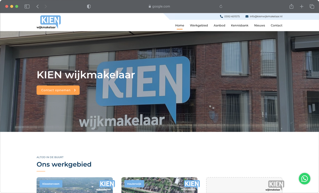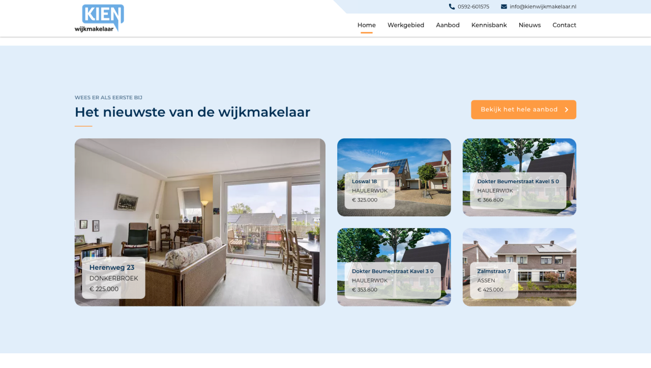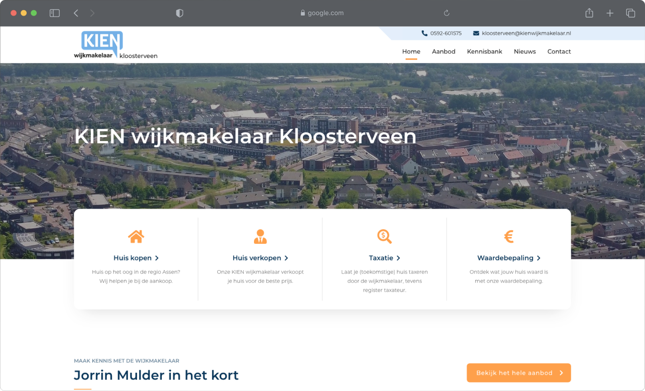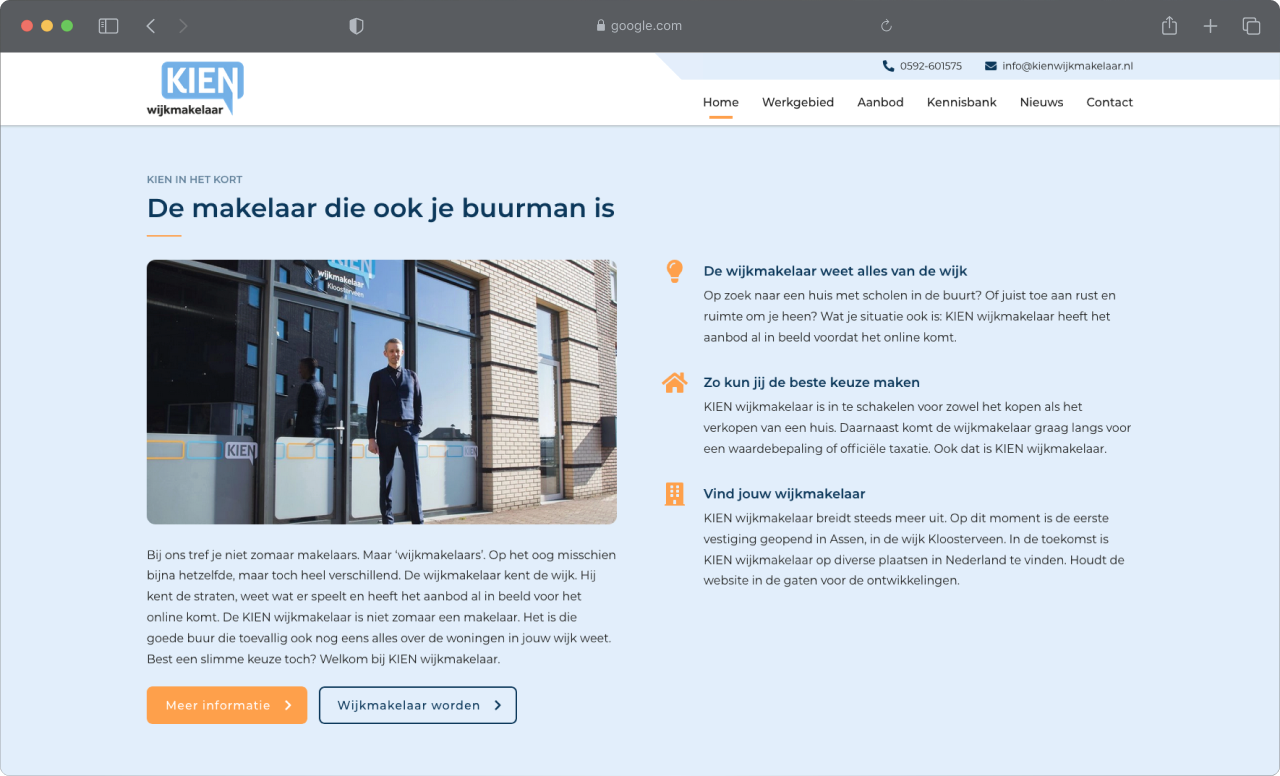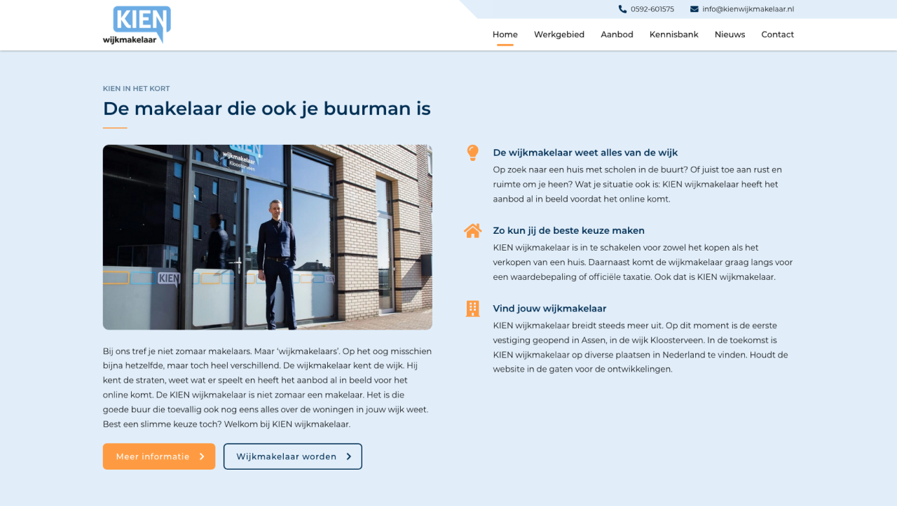 KIEN wijkmakelaar begon als een visie voor een nieuwe manier van te werk gaan als makelaar. In plaats van naar een groot makelaarskantoor gaan die huizen aanbied over de hele provincie, ga je naar een gespecialiseerde makelaar die alles weet over een wijk. Dat is het idee achter KIEN wijkmakelaar. De makelaar, maar ook die goede buur. Nog voordat een huis online staat weet hij al dat het aangeboden gaat worden waardoor jij een stapje voor bent op de rest.